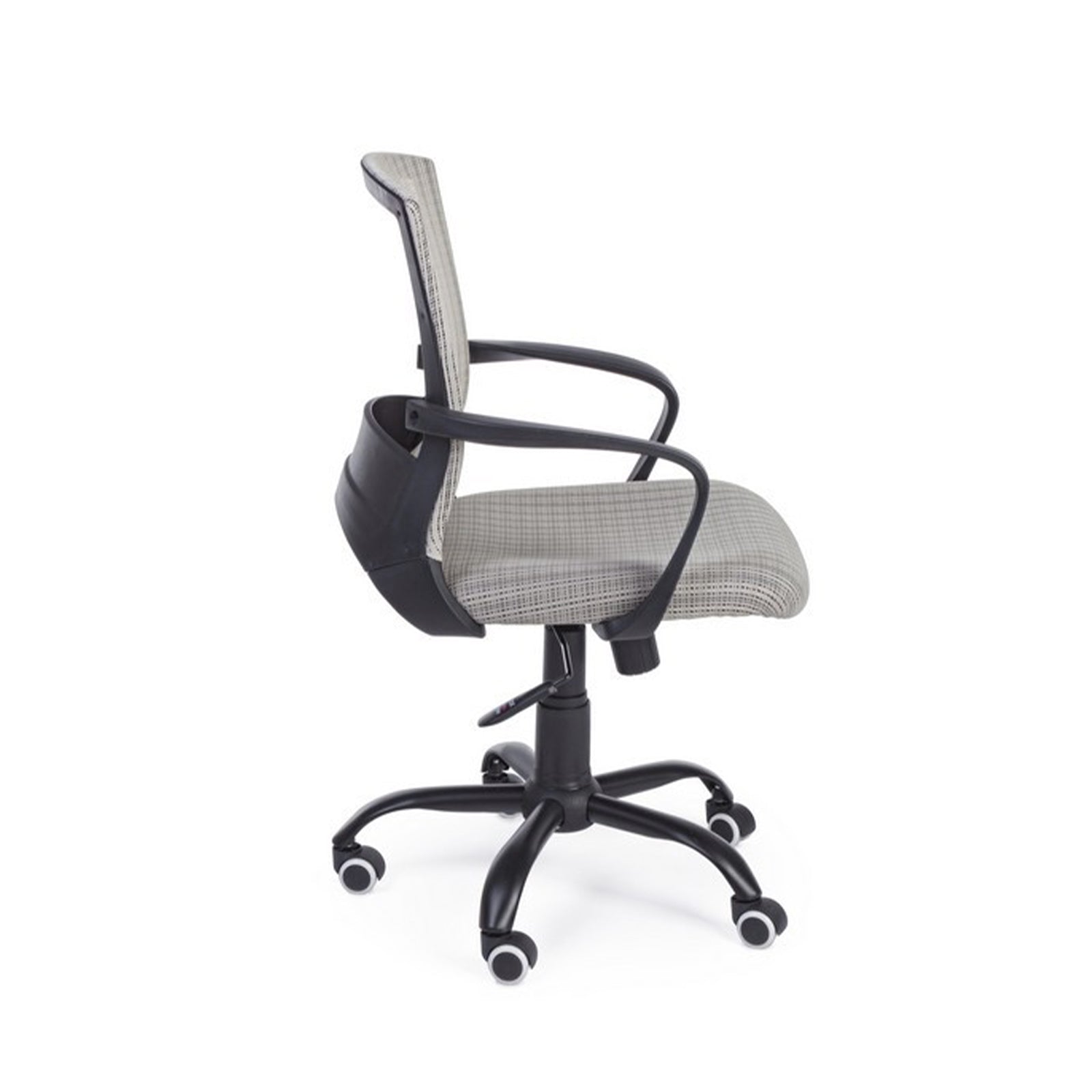 Cette chaise est équipée d'accoudoirs en plastique noir et de roulettes en plastique.