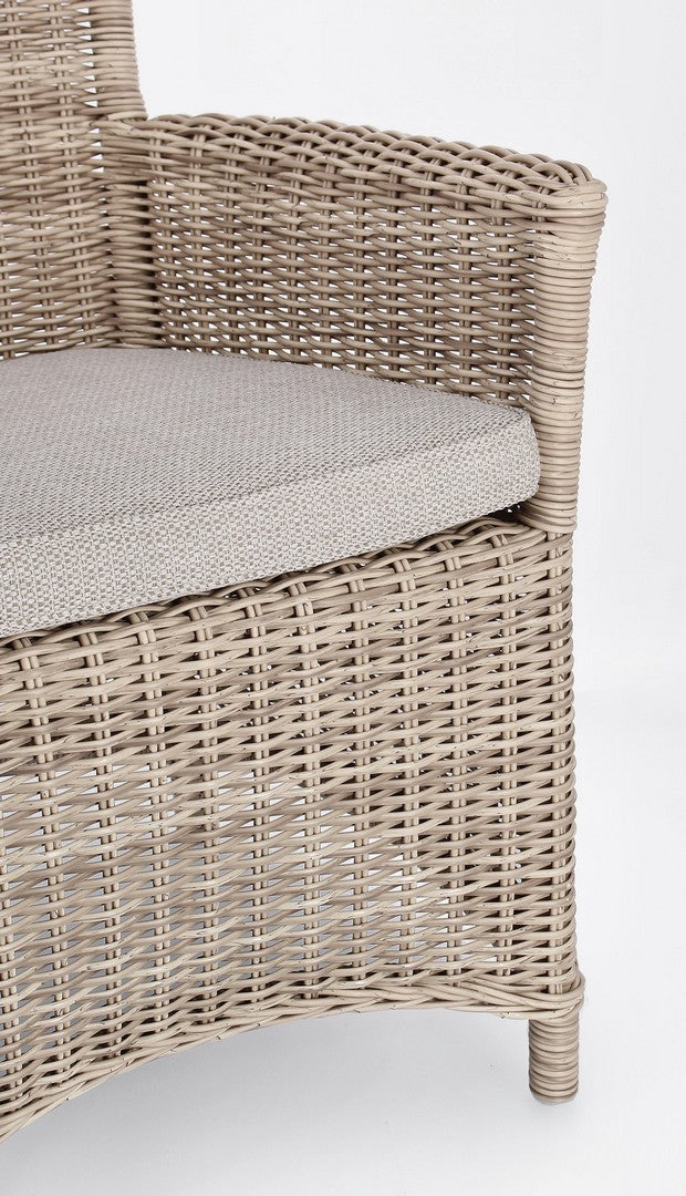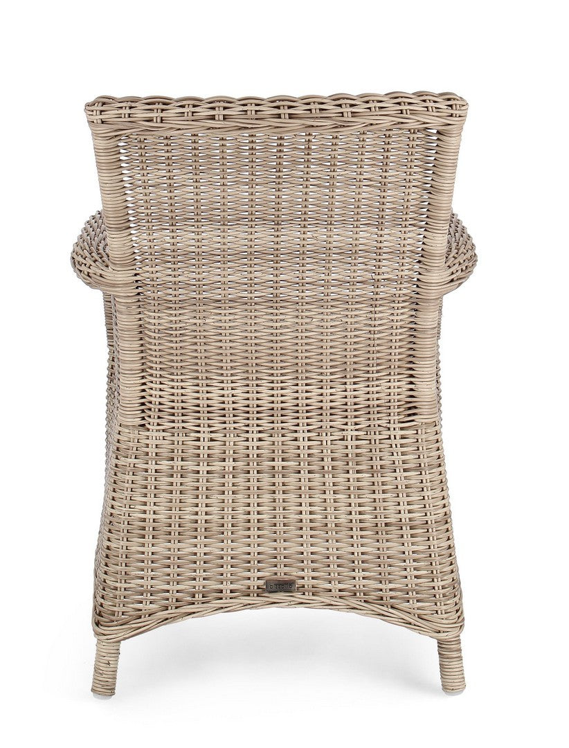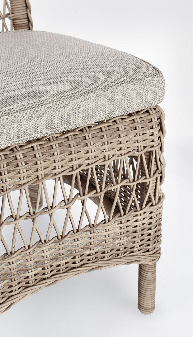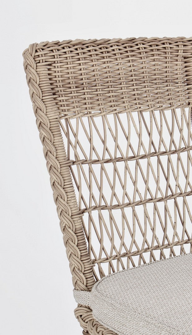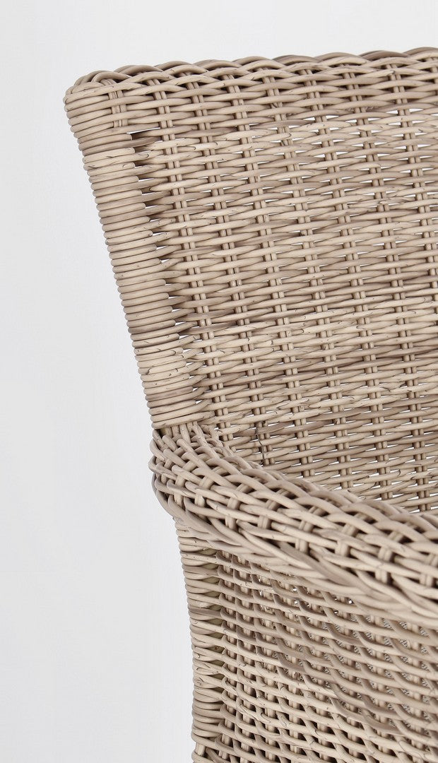La chaise présente un tissage en fibre synthétique, qui lui confère un aspect naturel et une haute résistance aux agents atmosphériques. Ce matériau est également facile à nettoyer et nécessite peu d’entretien.
