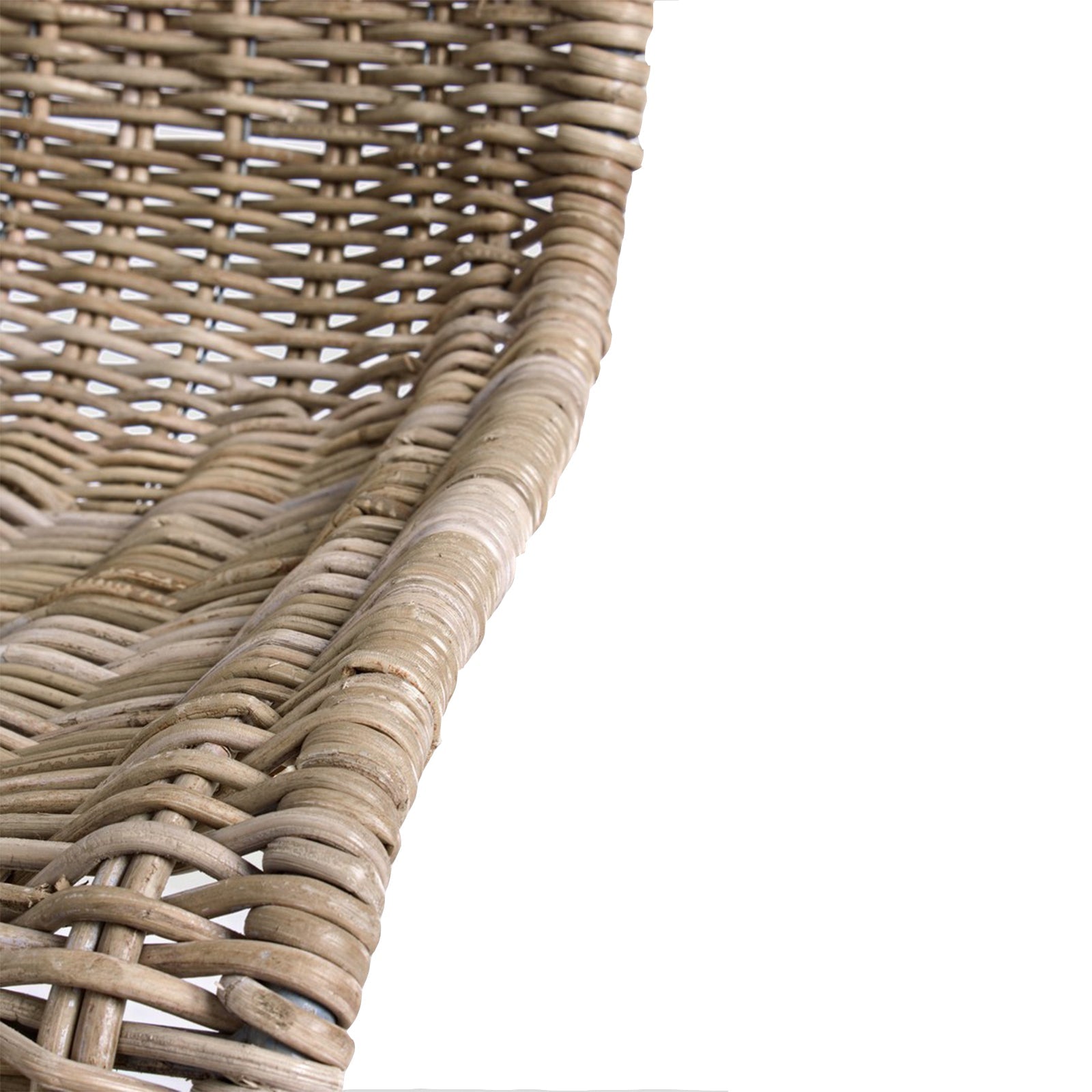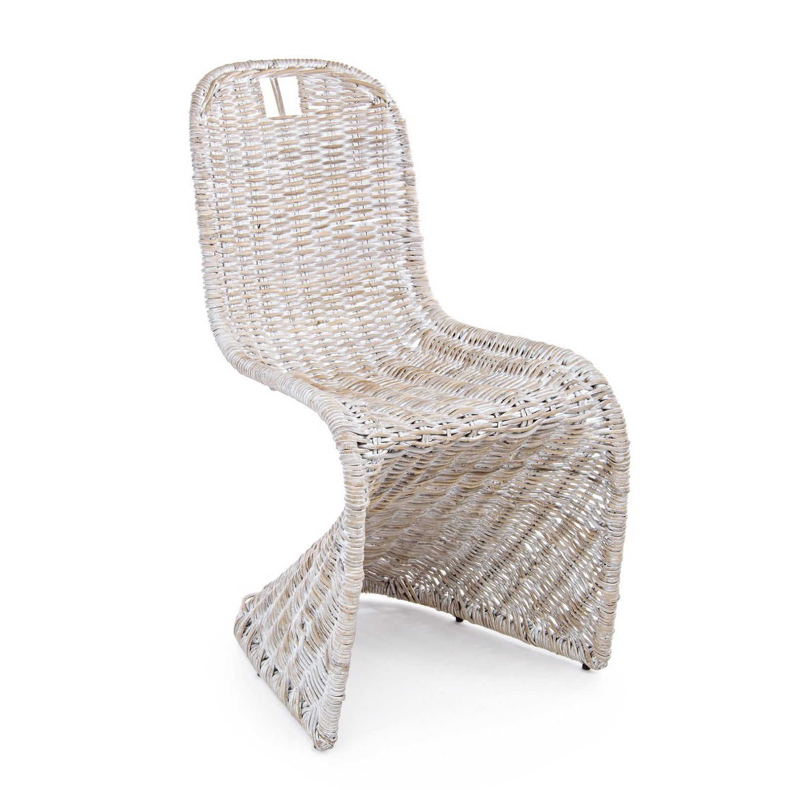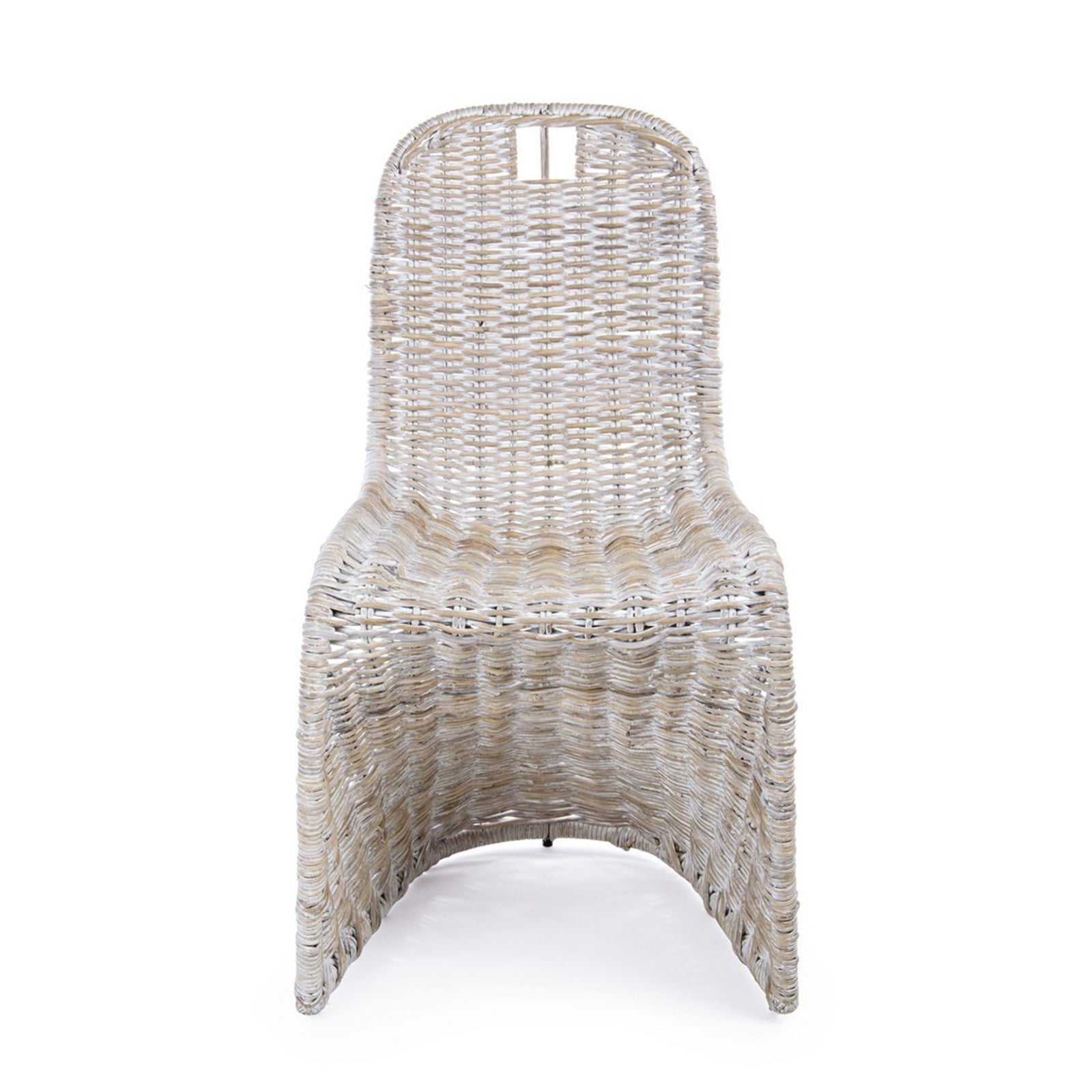 Un design délicat qui rappelle le provençal est celui de chaise de jardin fabriqué en rotin et agrémenté d'un tissage Kubu qui s'étend sur tout le périmètre du dossier arrondi et se prolonge le long des étagères jusqu'aux pieds.