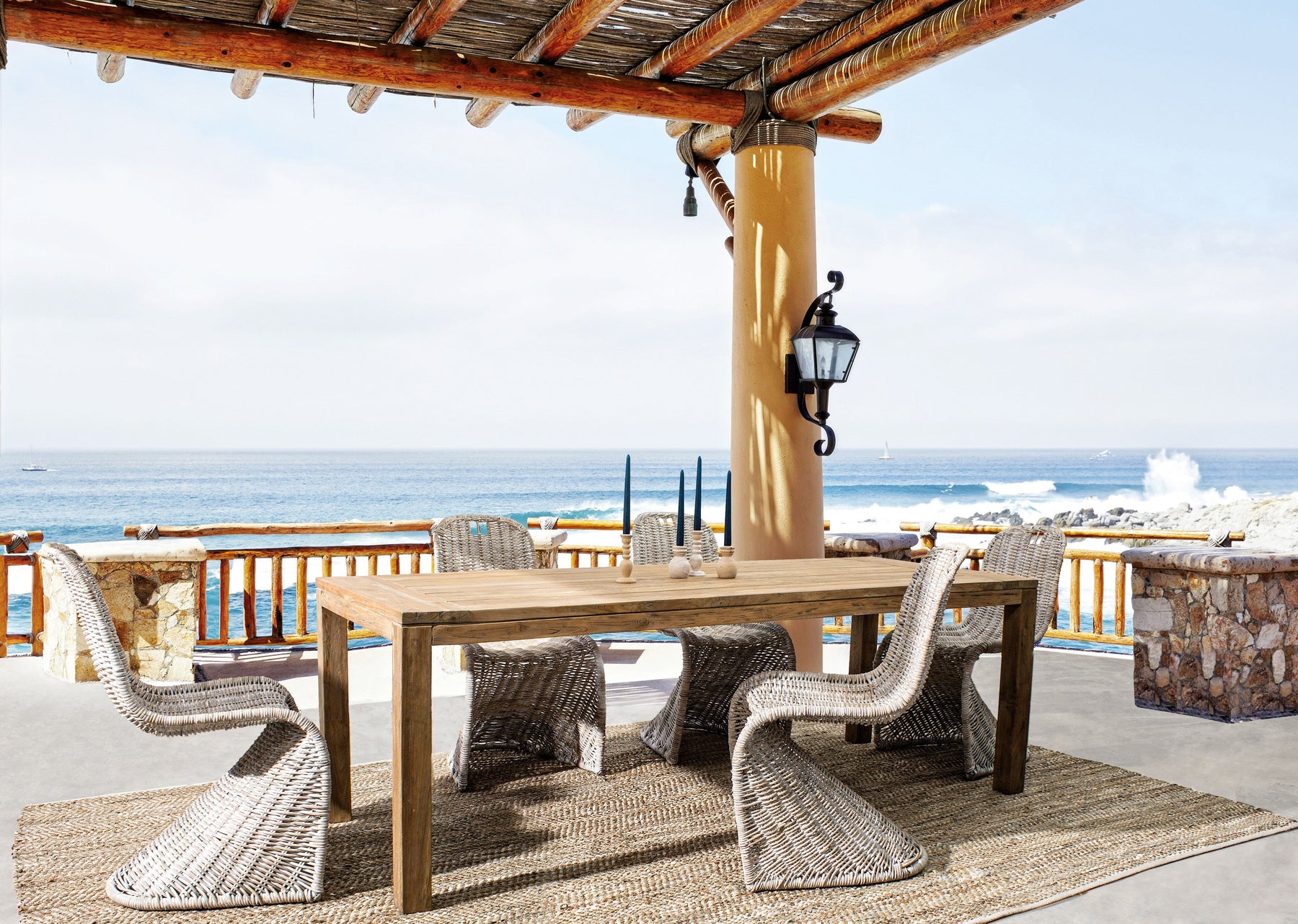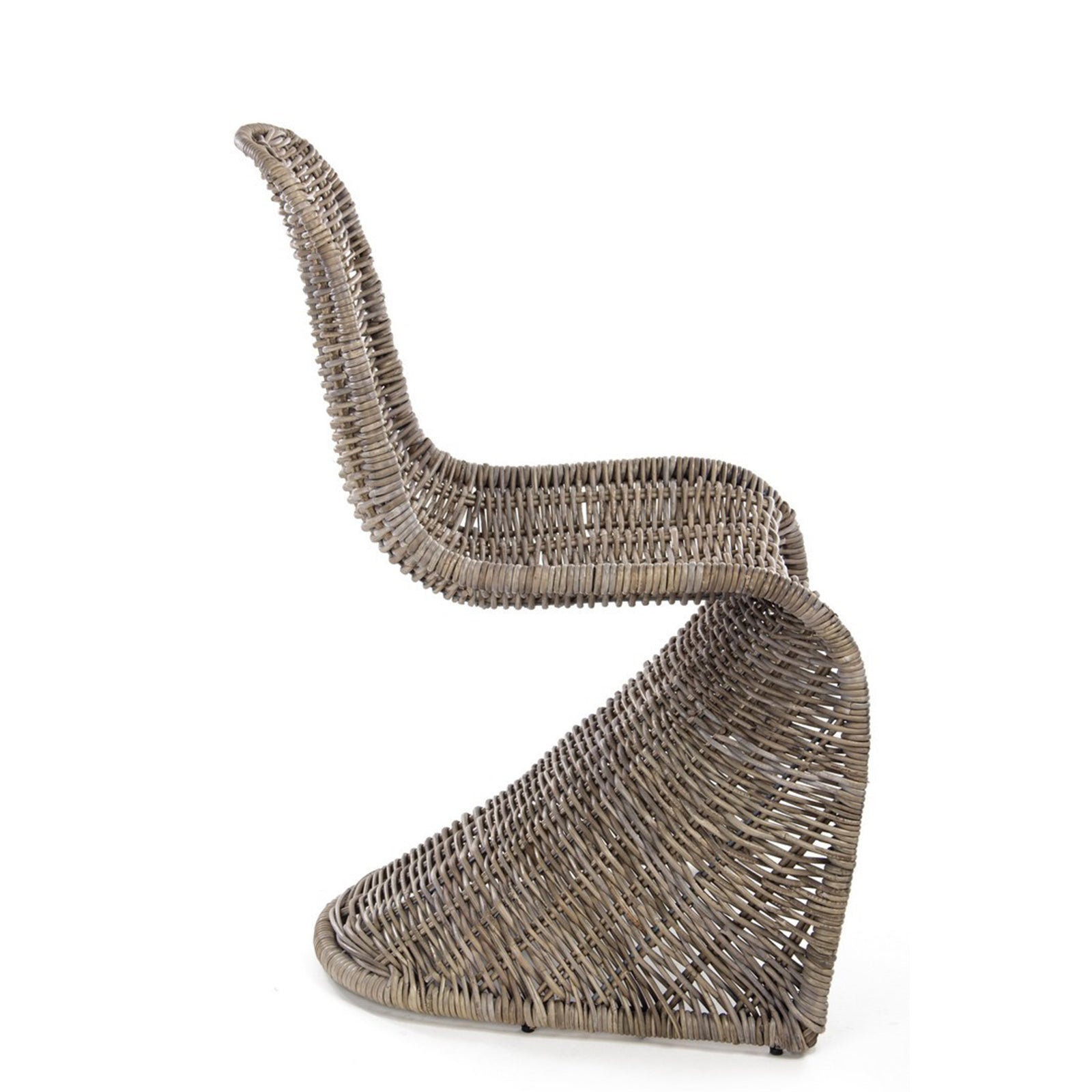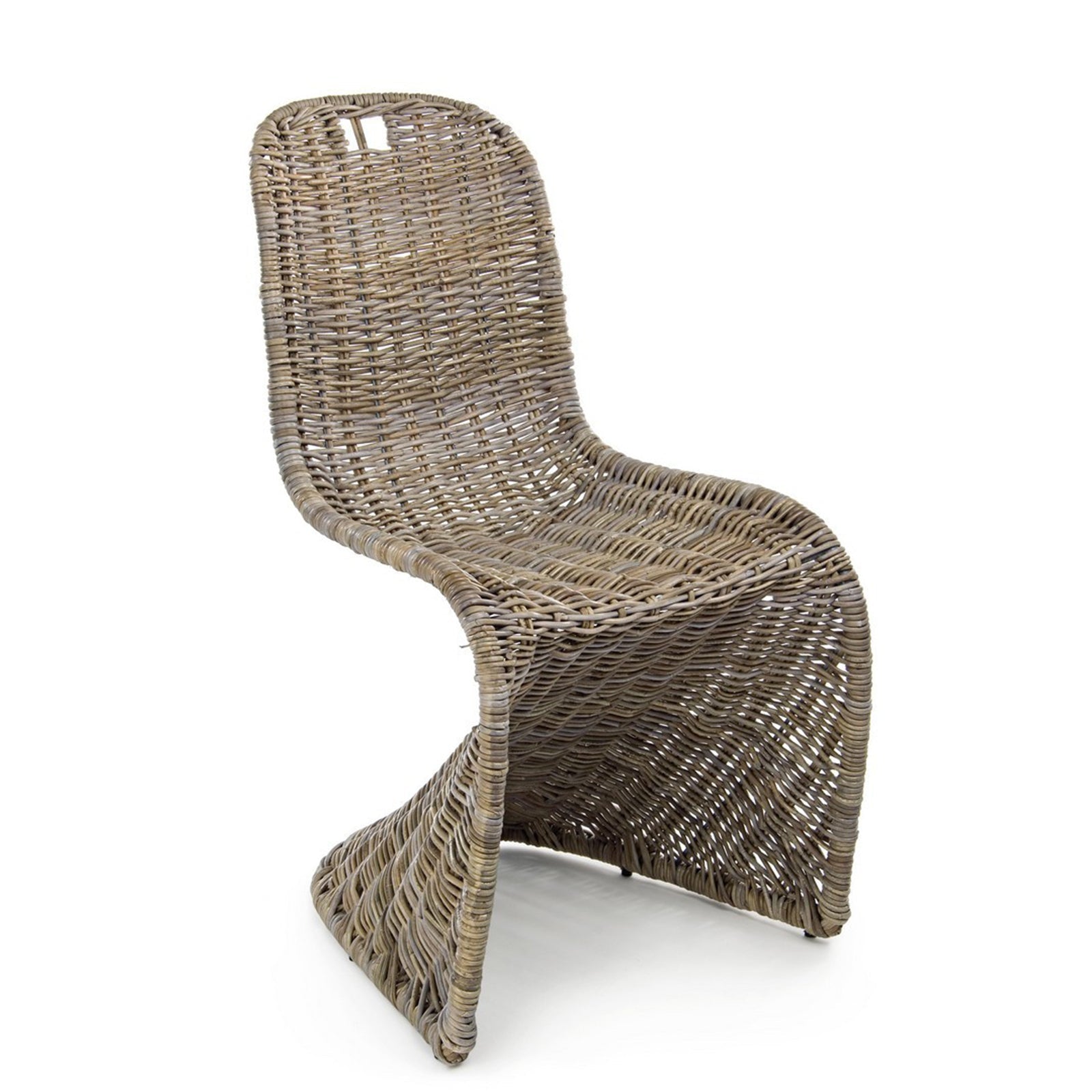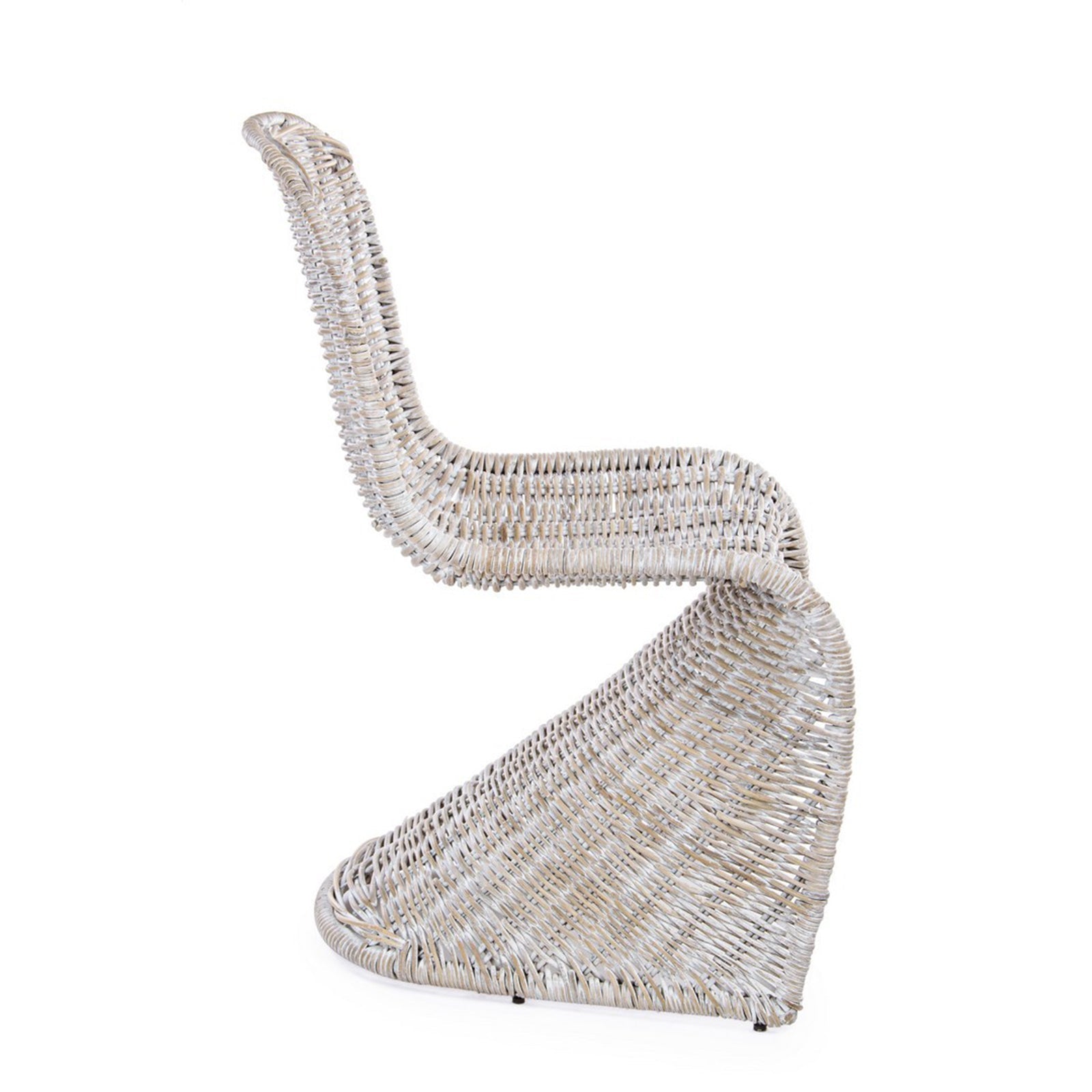Un design délicat qui rappelle le provençal est celui de chaise de jardin fabriqué en rotin et agrémenté d'un tissage Kubu qui s'étend sur tout le périmètre du dossier arrondi et se prolonge le long des étagères jusqu'aux pieds.