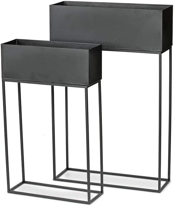L'ensemble se compose de 2 cache-pots de tailles différentes : la plus petite jardinière a une largeur de 32, une profondeur de 18 et une hauteur de 47 cm, la grande a une largeur de 55, une profondeur de 20 et une hauteur de 70 cm.
