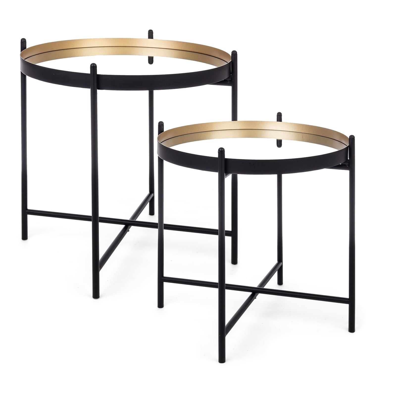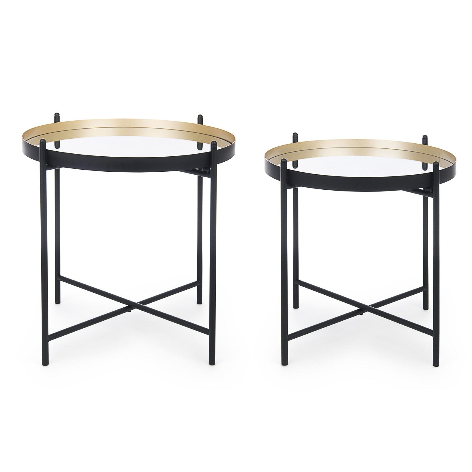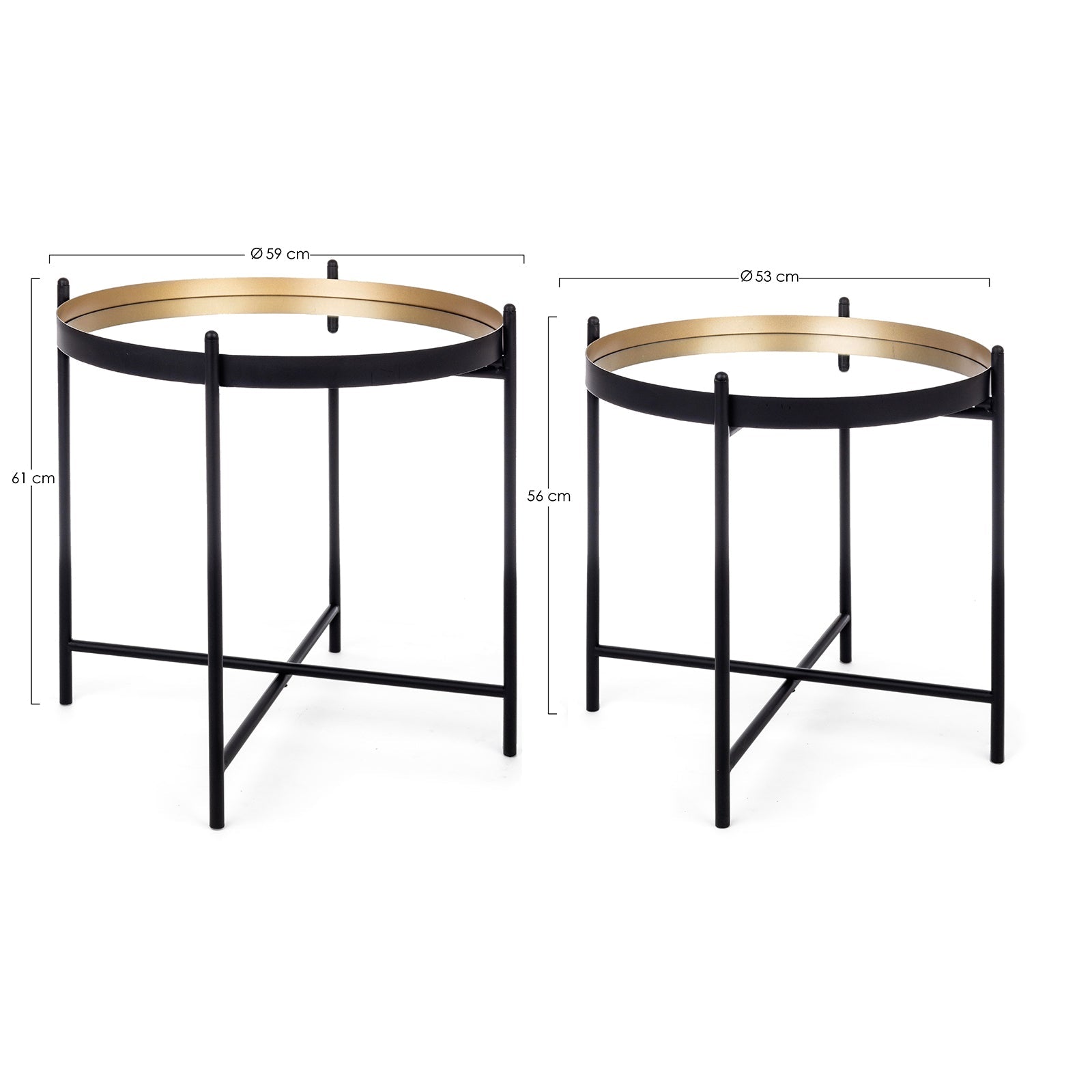 Les dimensions de la plus petite table sont Ø 53 x h 56 cm tandis que la plus grande table a une dimension de Ø 59 x h 61 cm.