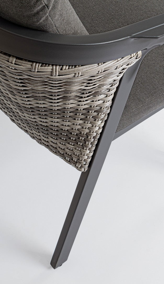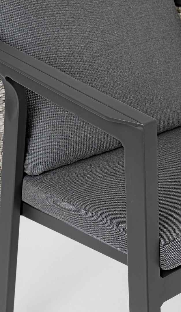 L'assise des chaises est recouverte de fibre synthétique, tandis que les coussins d'assise et de dossier sont amovibles et fabriqués en tissu oléfine (100 % polypropylène), parfait pour une utilisation en extérieur. La table est dotée de pieds réglables pour une plus grande stabilité et les vis sont en acier inoxydable pour garantir la résistance aux agents atmosphériques.