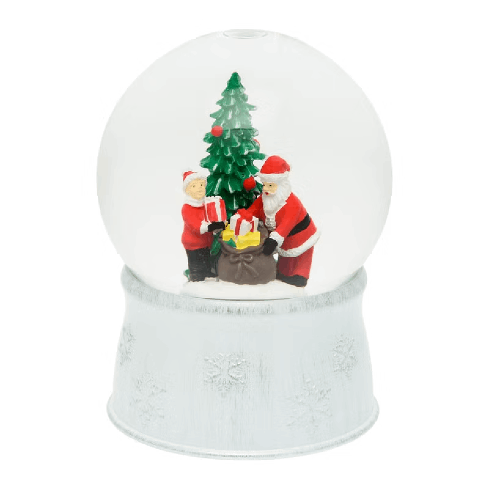 Fabriqué dans un style élégant blanc antique , la sphère présente un verre transparent qui révèle une scène enchanteresse : un sapin de Noël joliment décoré à côté du Père Noël, occupé à ranger les cadeaux dans son sac.