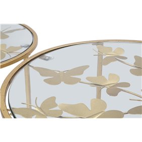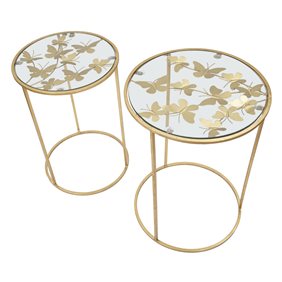 Paire de tables basses en métal doré avec étagère en verre aux papillons pour intérieur, set de 2