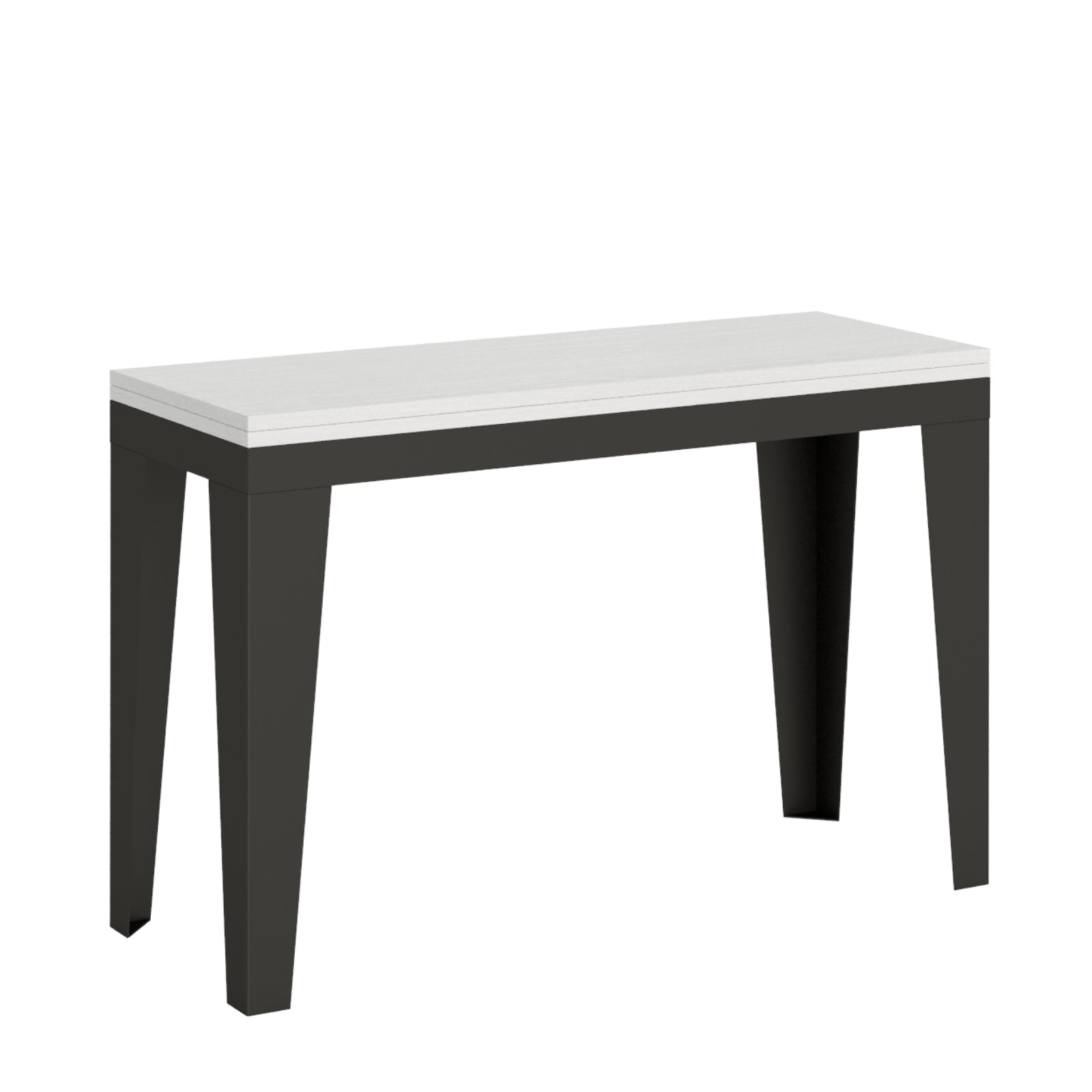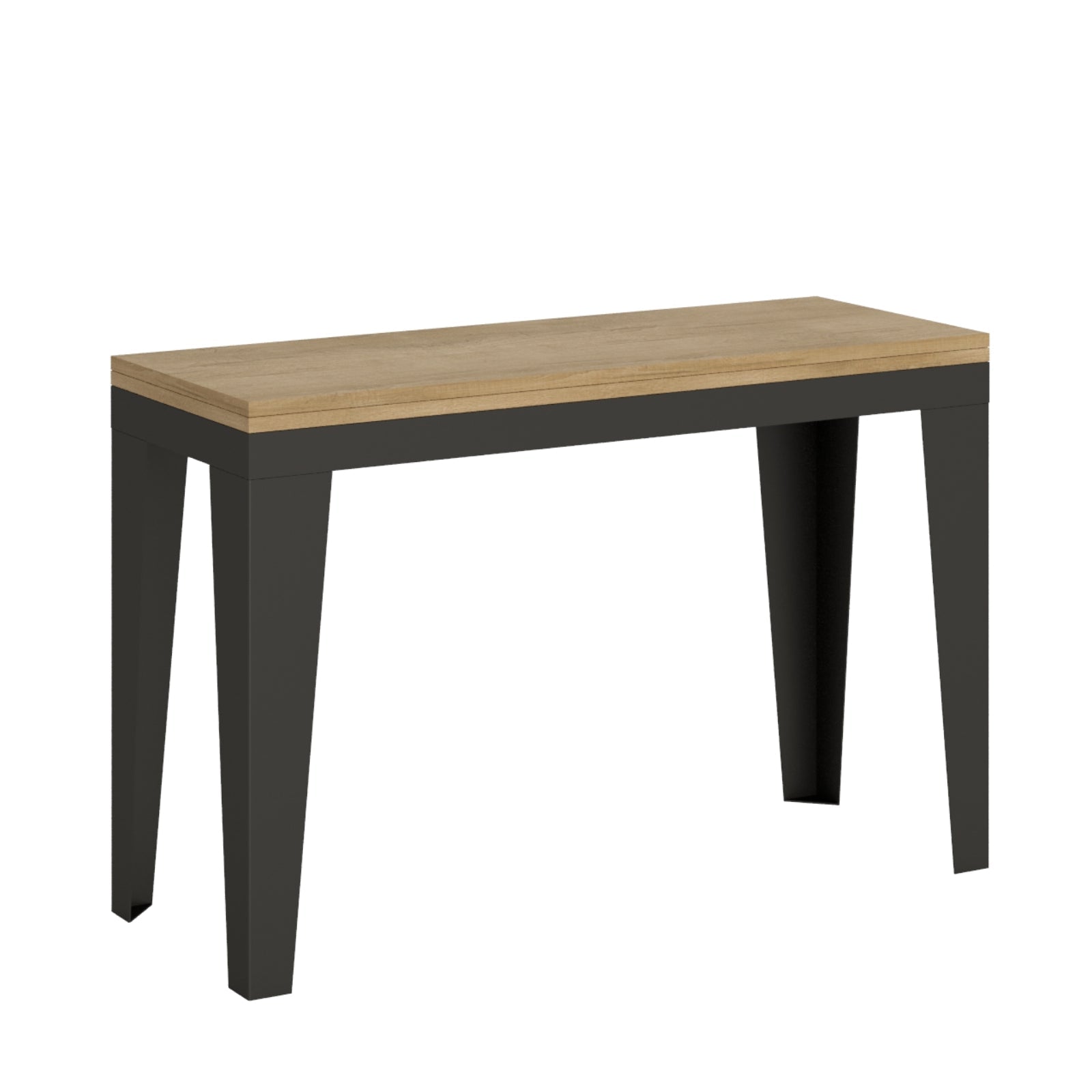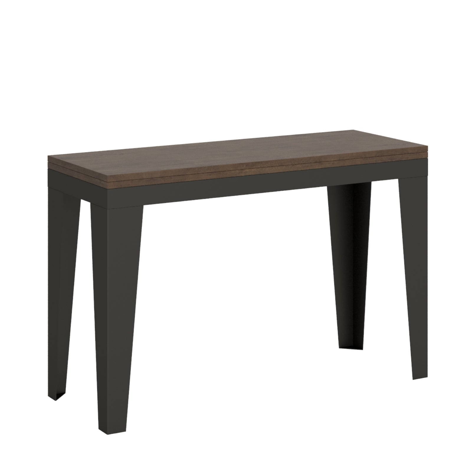 Lorsqu'elle n'est pas déployée, la table "Lucca" peut être placée contre un mur pour y déposer des objets de décoration ou comme plan de travail supplémentaire.