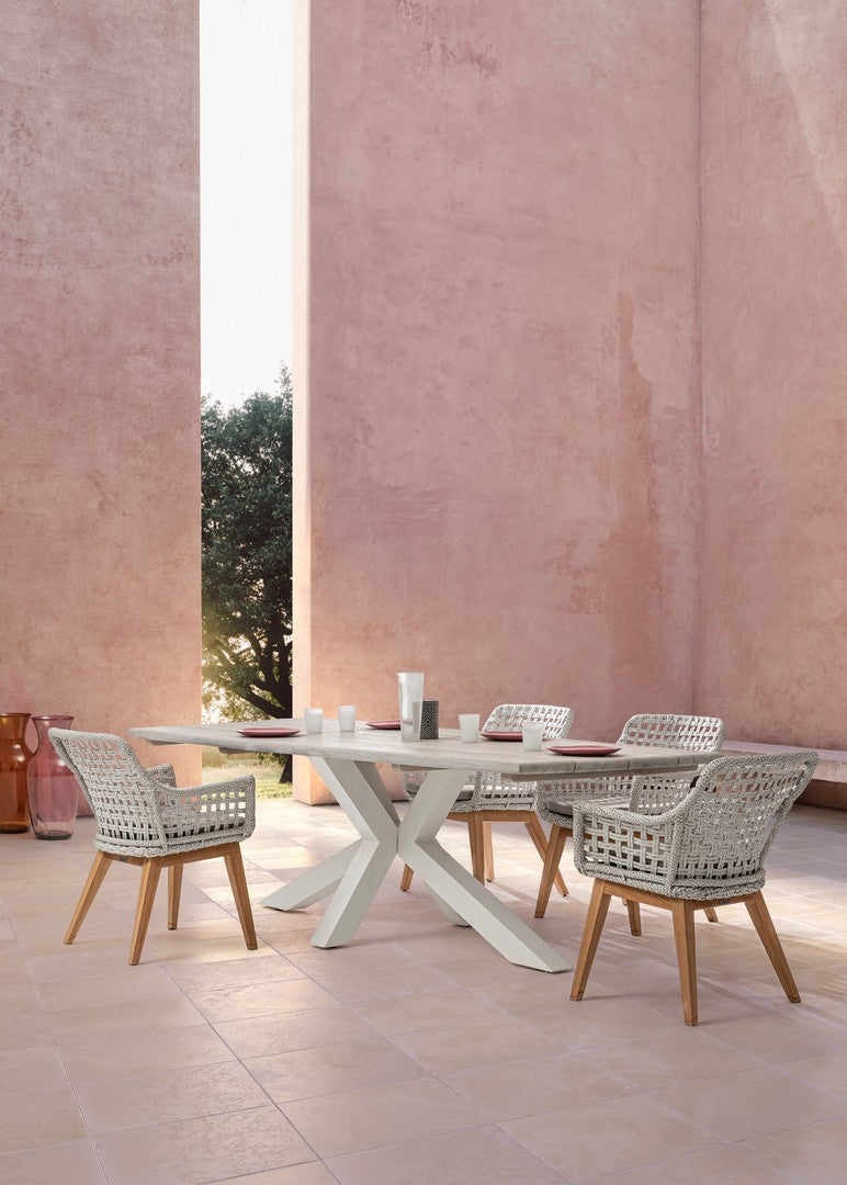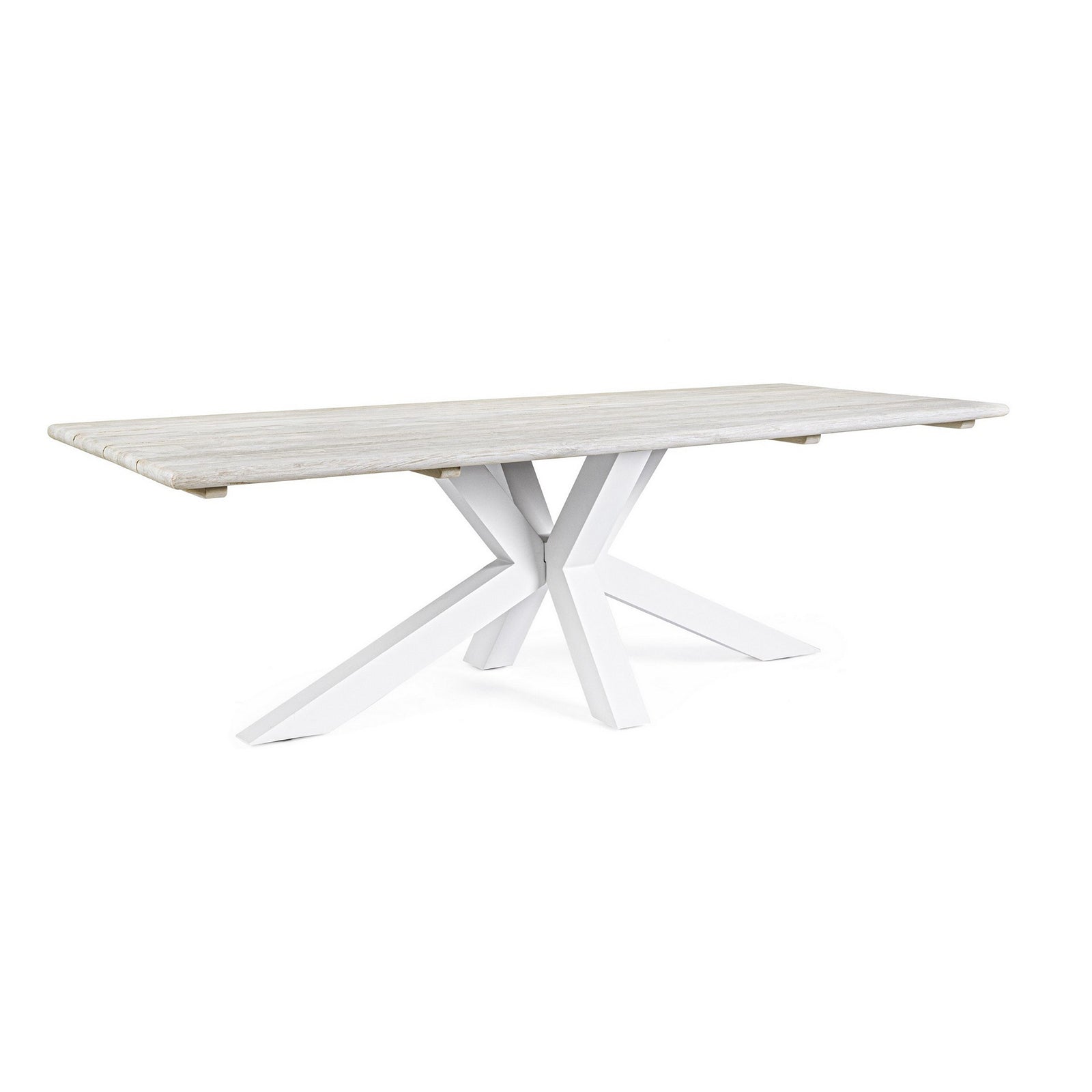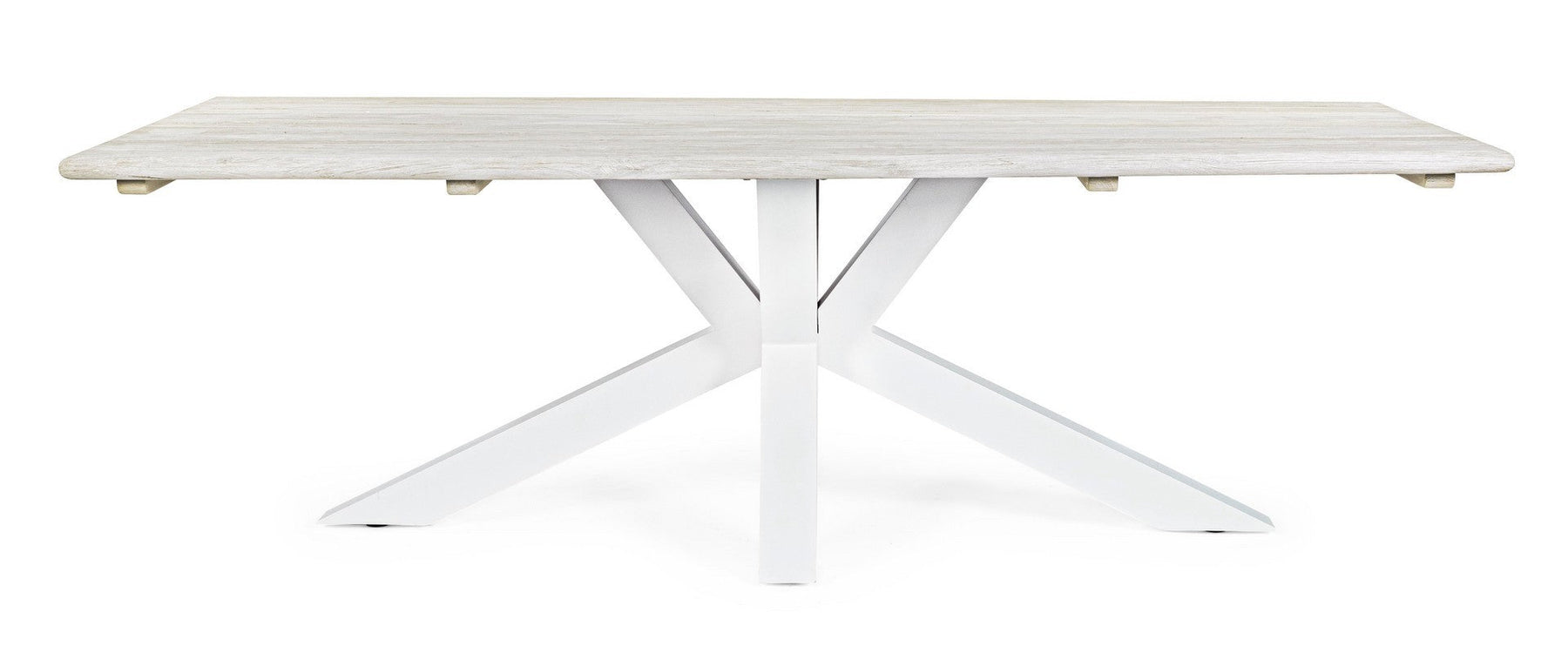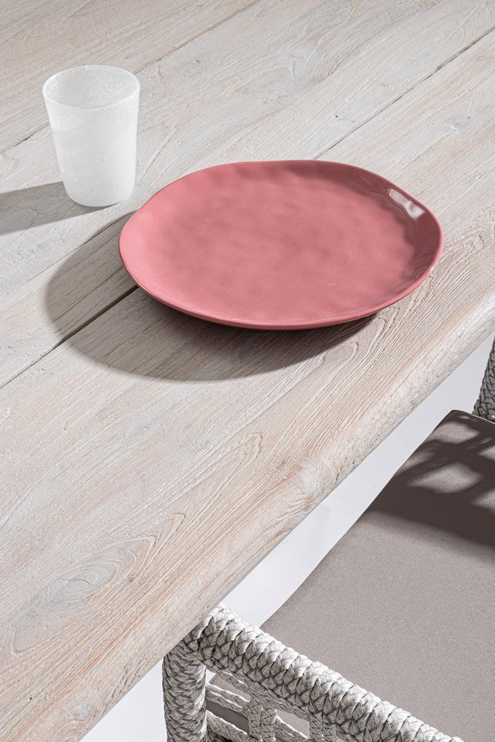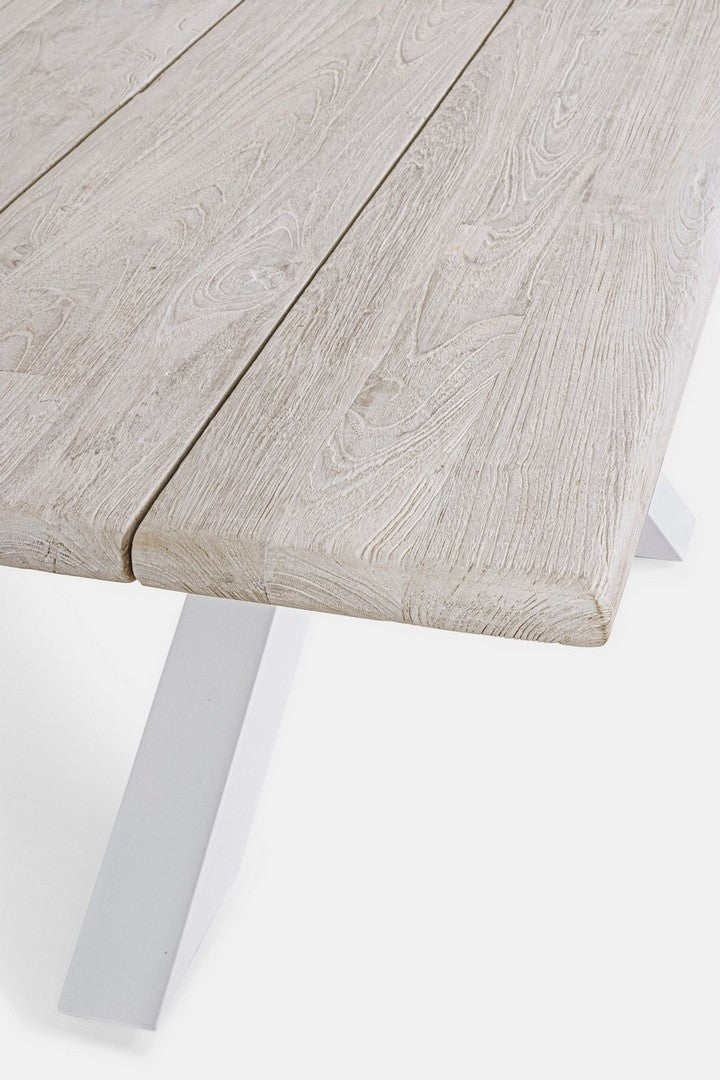 Prix régulier €2.249,90 Prix réduit €2.212,90La table "Reynald" est une table rectangulaire idéale pour un usage extérieur. Le plateau de la table est fabriqué en bois de teck recyclé issu de forêts durables, certifié SVLK. La finition du plateau est blanchie sur base acrylique avec un effet brossé, ce qui lui confère un look moderne et contemporain. Le bois de teck recyclé se caractérise par la présence de chevilles en bois de différentes essences et couleurs, qui le rendent unique et original.
