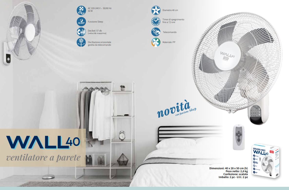 - 5 pales de 40 cm avec trois vitesses sélectionnables et possibilité de régler le débit d'air vers le haut ou vers le bas.