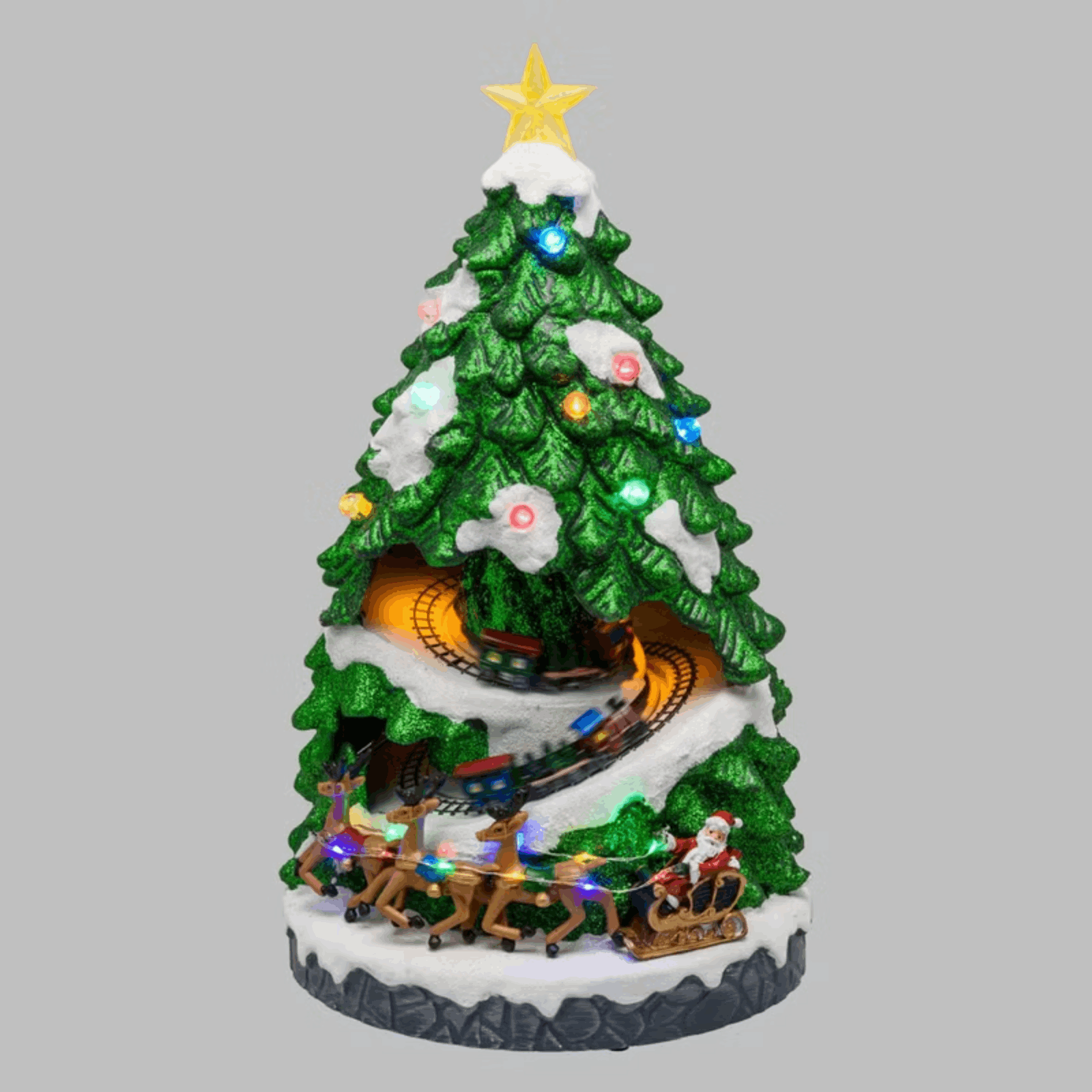 Prix régulier €89,90 Prix réduit €79,90Village de Noël représentant un sapin de Noël avec des trains en mouvement et des jeux de lumières colorées.