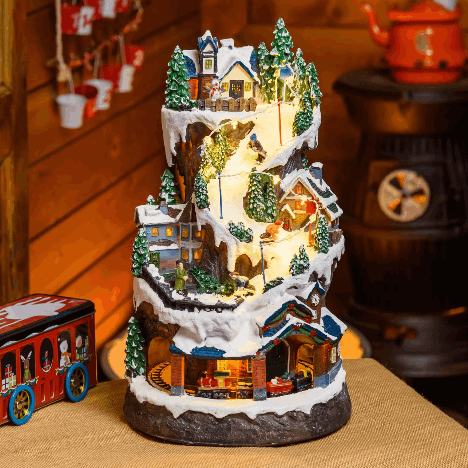 Village enneigé avec skieurs, train dans un tunnel mobile en polyrésine, h 38 cm